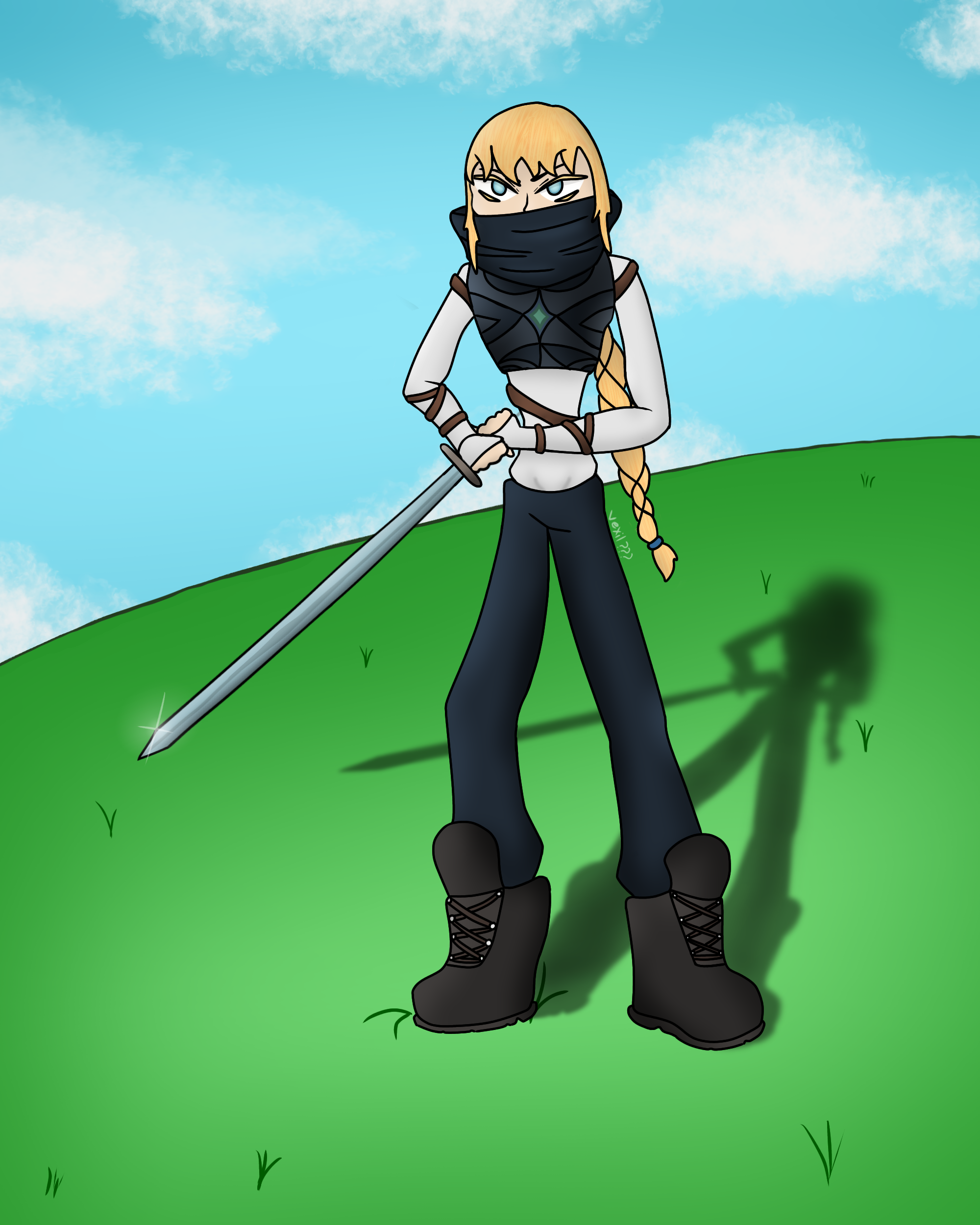 Vwula in a field, sword in hand